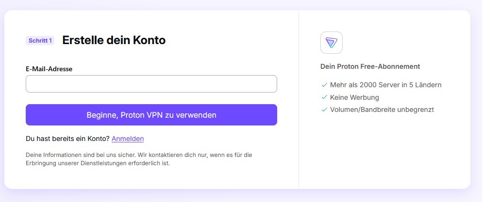 Gehe auf die Seite von Proton VPN. Erstelle einen kostenlosen Account und bestätige deine Emailadresse.