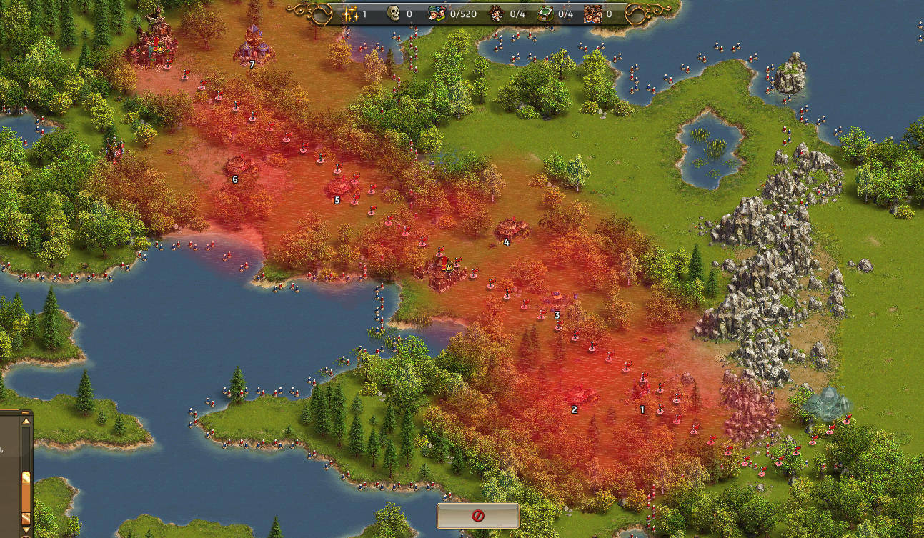 Zuerst benutzen wir die Wegvorschau, um den kürzesten Weg zum Kartenboss zu sehen und welche Lager wir auf dem Weg dorthin besiegen müssen. So können wir herausfinden, welche Einheiten wir benötigen, um zu gewinnen. Bei der kleinen Kolonie, hat man nur 520 Einheiten zur Verfügung. Mit denen muss man gut haushalten.