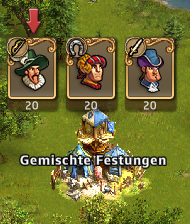 Als siebten Gegner haben wir eine gemischte Festung. Dort sind jeweils 20 FK, Reiter und NK drin. Also greifen wir mit einer gut gemischten Truppe an von jeweils 20 Einheiten. Zuerst wählen wir die Reiter aus und müssen dann während des Kampfes entsprechend die Einhieten wechseln.