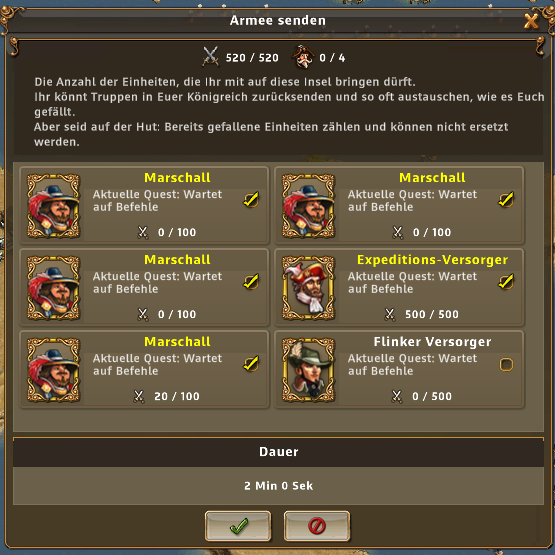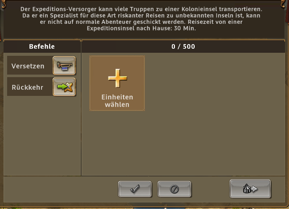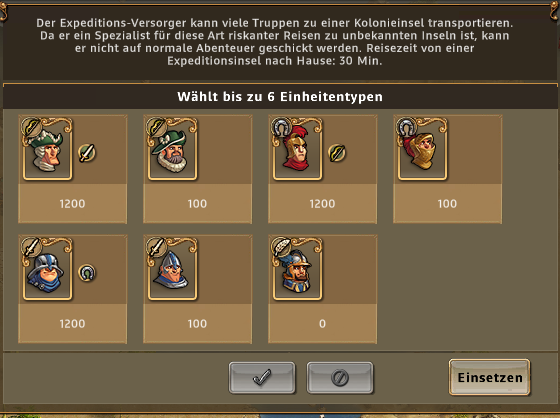 Wähle den Expeditions-Versorger aus und wähle die gewünschten Truppen. Bestätige dies und wir können unsere Spezialisten auf die Insel senden. Wir packen die restlichen 20 Einheiten noch in einen Marshall.